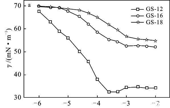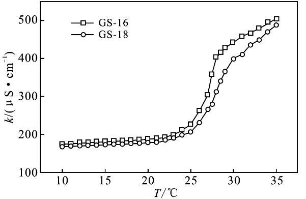 2.2.1 Krafft溫度Krafft溫度影響表面活性劑溶解度,表面活性劑在此溫度以上可以形成膠束。在Krafft溫度以下,以單分散的表面活性劑與水化固體表面活性劑的狀態(tài)存在,而在Krafft溫度以上,水化固體表面活性劑的溶解和膠束形成也參與了平衡[9-10]。質(zhì)量分數(shù)1%表面活性劑GS-12,在室溫可以完全溶解,將其溶液置于冰水混合物中1周,溶液仍然澄清透明,沒有渾濁的跡象。表明GS-12的Krafft溫度低于0℃。通過測量電導(dǎo)率可以得到Krafft溫度的近似值,由圖3可知,GS-16,GS-18的Krafft溫度分別為27,27.5℃。k值在較低溫度下緩慢增加,這是由于離子表面活性劑的溶解度有限。隨著溫度的進一步升高,Krafft溫度處的k值急劇增加。k值的增加是由于膠束的形成,水合表面活性劑的溶解度突然增加,直至達到克拉夫特溫度。此外,離子遷移率增加隨著溫度增加、k逐漸增加[3,10]。結(jié)果表明,Gemini表面活性劑的Krafft溫度隨表面活性劑的疏水鏈長的增加而升高。