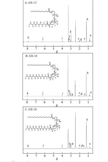 根據(jù)方案1的合成路線,成功制備了3種以1,4-二溴-2-丁烯為連接基團的酰胺基Gemini表面活性劑。利用紅外和核磁對酰胺基Gemini表面活性劑GS-12,GS-16,GS-18進行結(jié)構(gòu)表征,結(jié)果見圖1和圖2。