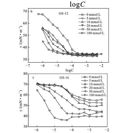 表面張力測量是研究表面活性劑CMC值的一種有效方法。濃度的增加降低了溶液的表面張力,然后達到一個恒定值,則會產(chǎn)生一個明確的轉(zhuǎn)折點,表明膠束化的開始。在CMC之下,表面活性劑分子排布于空氣/水界面上來降低表面張力。在CMC以上,外加表面活性劑單體,當(dāng)表面活性劑單體充分填充表面時,更傾向于與膠束結(jié)合而不是進入界面膜[3,7]。因此,γ與lgC的關(guān)系圖陡然減小,直至達到CMC,并在CMC以上變得相對恒定。圖5為不同的KBr鹽濃度下,陽離子Gemini表面活性劑混合溶液的表面張力圖。