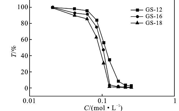 2.2.2耐鹽性能隨著鹽濃度的增加,濁度的突然增加是表面活性劑溶液中宏觀相分離的標(biāo)志,這就是鹽析現(xiàn)象[7,11]。圖4為KBr/GS表面活性劑溶液,隨著KBr含量的增加,在波長為500 nm的吸光度變化曲線。以GS-12為例,當(dāng)KBr濃度為0~60 mmol/L時,1 mmol/L的Gemini表面活性劑水溶液為無色透明,濁度同時略有下降,說明有混合膠束形成。當(dāng)KBr的濃度從60 mmol/L增加到120 mmol/L時,溶液呈現(xiàn)微渾濁,說明體系中有少量的表面活性劑顆粒析出。而GS-16,GS-18在更低的濃度下就發(fā)生了鹽析現(xiàn)象。也就是說,鹽的析出現(xiàn)象是非常復(fù)雜的,這不僅取決于鹽的性質(zhì),而且取決于雙子表面活性劑的結(jié)構(gòu)[12-13]。此外,由圖4透過率的變化可知,隨著疏水鏈的增長,表面活性劑的耐鹽性能減弱,更容易受鹽濃度的影響。因為無機鹽消除離子頭基團的電荷,減少吸附膜內(nèi)頭基基團與膠束之間的靜電排斥。它們通過減少頭基之間的靜電相互作用和最小化有效截面積來促進膠束的產(chǎn)生和聚集,導(dǎo)致表面活性劑從溶液中聚沉而析出[13]。