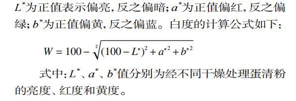 用色差儀直接測定蛋清粉的亮度值(L*)、紅(a*)、黃(b*)。測定5次取平均值。L*為正值表示偏亮,反之偏暗;a*為正值偏紅,反之偏綠;b*為正值偏黃,反之偏藍(lán)。白度的計(jì)算公式如下: