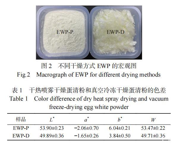 如圖2所示,EWP-P為細膩的鵝黃色顆粒粉末,EWP-D為松散的黃色片狀物。EWP-P的L*、a*和b*值分別為53.90±0.23、?2.06±0.70和6.04±0.21。EWP-D的L*、a*和b*值分別為49.89±0.36、?1.65±0.26和3.84±0.50(表1)。EWP-P的b*值較大是因為蛋清蛋白中的葡萄糖在噴霧干燥過程中與蛋白發(fā)生了美拉德反應。此外,真空冷凍干燥需將樣品進行冷凍預處理,冷凍過程中,蛋清蛋白會發(fā)生褐變反應,故EWP-D最終呈現(xiàn)出的顏色較EWP-P黃(圖2)。EWP-P的顏色較EWP-D白(圖2),可能是因為干熱噴霧干燥的干燥速度快,蛋清中的蛋白質受熱時間短。因此在本實驗干燥條件下,干熱噴霧干燥所得的蛋清蛋白粉更亮、更白,易被消費者接受。