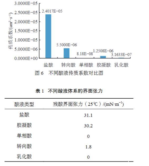 以鹽酸、膠凝酸、轉(zhuǎn)向酸和乳化酸為對比,測定不同酸液體系傳質(zhì)系數(shù),實驗結(jié)果見圖6。單相酸體系緩速效果最強(qiáng),比乳化酸體系還下降了一個數(shù)量級,緩速率為99.6%,可以達(dá)到緩速深部酸化的效果。單相酸相比于乳化酸酸巖反應(yīng)速度明顯下降,這與乳化酸粒徑研究結(jié)論也是相似的:粒徑越小,酸巖反應(yīng)速度越慢。