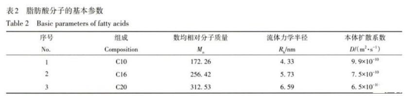 對(duì)比不同鏈長脂肪酸在不同質(zhì)量濃度時(shí)的動(dòng)態(tài)界面張力(圖9A-9C),發(fā)現(xiàn)雖然脂肪酸在正辛烷中的擴(kuò)散系數(shù)隨著碳鏈的增長而減小(表2),但添加高質(zhì)量濃度C20酸時(shí),界面張力值到達(dá)平衡的時(shí)間明顯縮短,這表明脂肪酸烷基鏈長度會(huì)影響脂肪酸在界面的性質(zhì)。并且發(fā)現(xiàn)脂肪酸烷基鏈越長,與NH2-PEG-GO協(xié)同穩(wěn)定的水-正辛烷界面張力越低。并且隨著脂肪酸質(zhì)量濃度增加,烷基鏈鏈長增加對(duì)界面張力降低效果越明顯(圖9D)。
