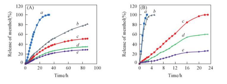 白家峰等采用聚多巴胺(PDA)修飾的介孔二氧化硅微球負(fù)載L-薄荷醇,發(fā)現(xiàn)PDA涂層有利于薄荷醇的可控緩慢釋放,在30℃空氣吹掃作用下,負(fù)載樣品中的薄荷醇在25 h后幾乎釋放完全;而在80℃空氣吹掃作用下,負(fù)載樣品中的薄荷醇在100 min后接近完全釋放??梢姡狙芯恐频玫呢?fù)載體系具有較優(yōu)的長效緩釋性能。