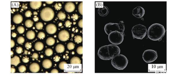 以DA-GQD為顆粒乳化劑、L-薄荷醇(熱熔)為油相制備的Pickering乳液的光學(xué)顯微鏡照片(OM)如圖5(A)所示。從圖5(A)可以看出,Pickering乳滴粒徑約為10μm,具有規(guī)則統(tǒng)一的球形形貌。由于DA-GQD具有較高的親水性,因此傾向于形成穩(wěn)定的水包油型乳液。DA-GQD固體顆粒分散在薄荷醇/水界面,這是因?yàn)橐?液界面的一部分被液-顆粒界面代替時(shí)總界面能降低,L-薄荷醇被微小的石墨烯片覆蓋,位于液滴的中心。