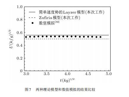 最后,我們將兩種理論模型的結(jié)果與數(shù)值模擬進行了比較,如圖7所示。在誤差允許的范圍內(nèi),Zufiria模型和Layzer模型與數(shù)值模擬符合的都很好。由簡單速度勢的Layzer模型得出的結(jié)果更接近于數(shù)值模擬。另外,從圖7中還可以看出,簡單速度勢的Layzer模型計算值比數(shù)值模擬結(jié)果高,而Zufiria模型比數(shù)值模擬低。這可能由于Zufiria模型假設速度勢是復數(shù)勢,會人為引進速度的耗散,導致結(jié)果比數(shù)值模擬低,而Layzer模型的計算值略高于數(shù)值模擬的原因可能由于數(shù)值模擬沒有達到漸近速度。