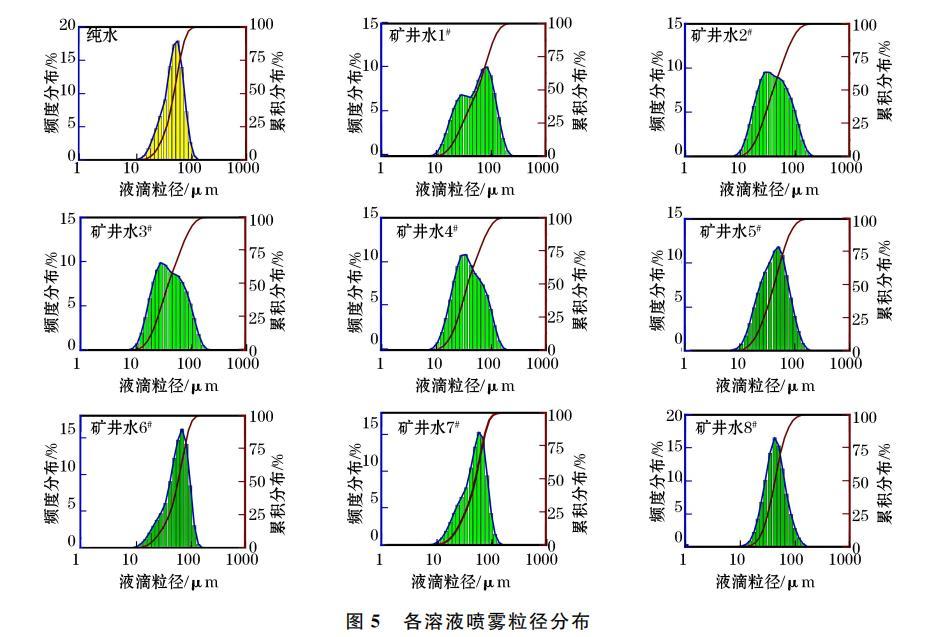 噴霧降塵效果與霧化特性參數(shù)密切相關(guān),其中霧滴粒徑是影響霧化特性的關(guān)鍵因素。9組溶液在15cm測(cè)點(diǎn)處的粒徑分布如圖5所示。由圖5可知,各溶液霧滴粒徑主要分布為25~75μm,純水、礦井水1#至4#和礦井水5#至8#噴霧粒徑位于該區(qū)間的平均比例分別為80.10%、55.87%、69.73%,礦井水1至8#的粒徑累積分布曲線斜率逐漸增加,這說(shuō)明礦井水霧化效果不斷提升。由此可知,礦井水中Na+、K+離子濃度越低,霧滴粒徑分布越集中,其霧場(chǎng)更有利于呼吸性粉塵捕集。這是由于礦井水表面張力減小,霧滴破碎程度逐漸提高,致使霧滴細(xì)化且粒徑集中分布于25~75μm區(qū)間,這說(shuō)明噴霧霧化特性隨表面張力減小不斷優(yōu)化,霧滴粒徑趨向均勻分布。綜上,礦井水中Na+、K+離子濃度差異改變其表面張力,從而影響噴霧粒徑分布、霧化百分比等特性。