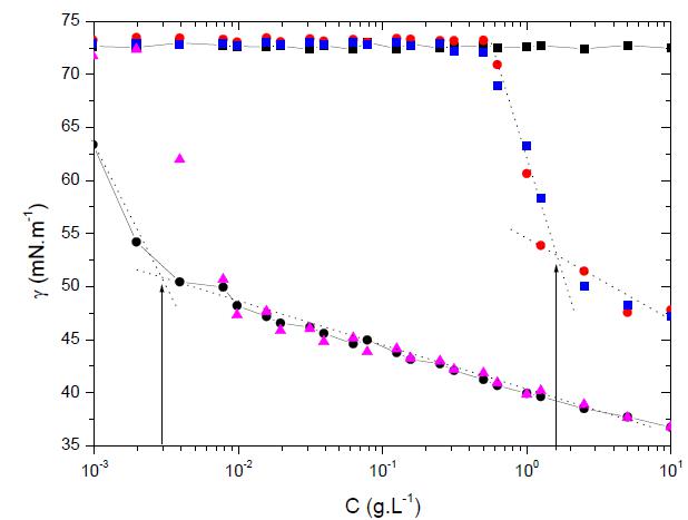 微流控技術(shù)是一種利用微米尺度管道及其它輔助手段對納升、皮升級流體單元進(jìn)行主、被動操縱的新興技術(shù)。近年來,Karakasyan研究團(tuán)隊?wèi)?yīng)用微液滴微流控技術(shù)制備出單分散響應(yīng)型的聚醚胺-海藻酸鹽共聚的微凝膠(Colloids and Surfaces B:Biointerfaces,2015,135,619–629),聚醚胺(PEA)與環(huán)氧丙烷/環(huán)氧乙烷(29/6)通過兩種分子之間的胺鍵相連接枝共聚得到海藻酸鹽接枝型的微凝膠。液滴微流控技術(shù)為海藻酸鹽接枝微凝膠提供了精準(zhǔn)的尺寸和物理化學(xué)性質(zhì)控制,使得這些微凝膠與單獨(dú)的海藻酸接枝鏈比,仍然保持有兩親型和熱敏性等性質(zhì),應(yīng)用表面張力測試技術(shù)研究微凝膠的表面化學(xué)性質(zhì),通過使用Delta-8高通量表面張力分析儀,采用Du Nouy-Padday法(最大拉力法)測試了不同濃度比例的組成聚醚胺-海藻酸鹽共聚物化合物的表面張力,并自動將表面張力記錄到系統(tǒng)中,由于Delta-8高通量表面張力儀能夠一次性測試96個樣品,軟件對測試的樣品的數(shù)據(jù)能夠進(jìn)行自動分析,從而獲得了聚醚胺-海藻酸鹽共聚物的臨界聚集濃度(CAC)以及臨界膠束濃度(CMC)。(如下圖1所示)。