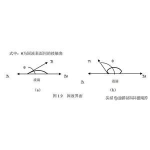 不同的液體在同種固體表面上,得到不同的接觸角。接觸角小的液體表面張力小。接觸角的大小衡量著固體表面與液體之間的潤濕性。圖1.9(a)中的接觸角小,表示固液間的潤濕性好。而圖1.9(b)中的接觸角大,表示固液間的潤濕性差。