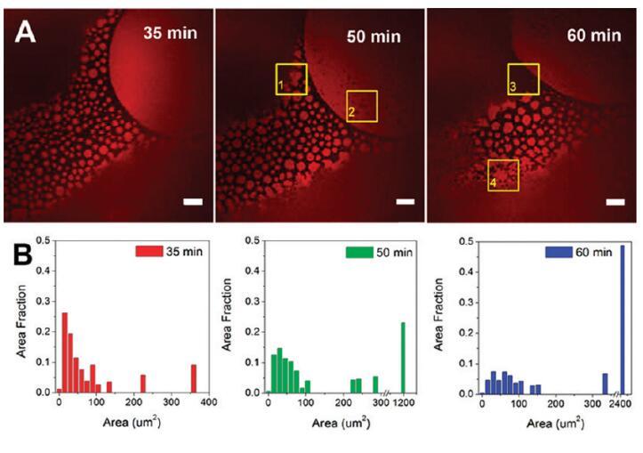 圖5。蛋白質(zhì)島隨時間的聚合。(A)導入后35、50和60分鐘拍攝的共焦熒光圖像。比例尺:20μm.(B)蛋白質(zhì)島大小分布的直方圖。初始亞期濃度為[HSA-TR]=0.50 mg/mL和[F-127]=0.015 mg/mL。ROI-1表示一個區(qū)域(黃色框),其中小的蛋白質(zhì)島與周圍的蛋白質(zhì)島結(jié)合形成一個較大的島;ROI-2表明該區(qū)域形成了小黑洞;ROI-3表示在表面活性劑富集區(qū)域的邊界處的運動;ROI-4顯示了小的蛋白質(zhì)島合并成網(wǎng)狀網(wǎng)絡的地方。