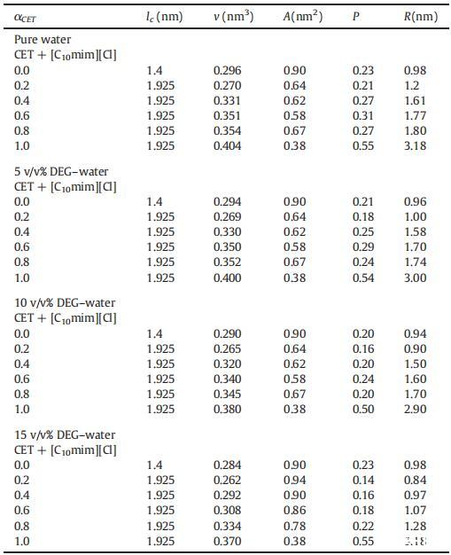 表5在純水中以及在T=298.15 K下存在不同體積百分比的DEG+水二元混合物時(shí),純CET、[C10min][Cl]和混合物CET+[C10min][Cl]的有效疏水鏈長(zhǎng)度(lc)、疏水鏈體積(v)、極性頭基團(tuán)表面積(A)、填充參數(shù)(P)和半徑(R)的值。