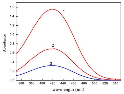 圖5.[CET]對(duì)水性甲酚紅染料可見光譜的影響:(1)[CET]=0mm,(2)[CET]=0.50mm,(3)[CET]=20mm。[CR]=3×10?5毫米。