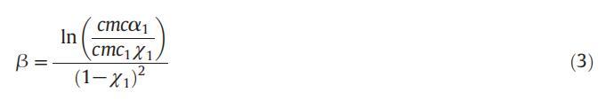 由β表示的相互作用參數(shù)給出了混合膠束中兩個(gè)單體之間的吸引相互作用的信息,可使用式(3)計(jì)算: