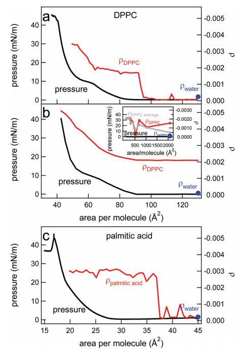 SFG光譜中不同振動的積分SFG強度與圖6a中的表面壓力一起繪制,作為每個分子面積的函數(shù)。CH強度隨著表面DPPC分子數(shù)量的增加而非線性增加。水信號持續(xù)增加,而自由OH信號隨著表面分子數(shù)量的增加而持續(xù)減少,正如預(yù)期的那樣,當(dāng)系統(tǒng)達(dá)到液體膨脹相時,27達(dá)到零值。原則上,在氣相和液相膨脹相的共存區(qū)(如上~每個分子100?2),人們可能會看到波動的SFG信號,因為氣相不發(fā)出信號,而液相膨脹相發(fā)出信號。用二次諧波發(fā)生器28和橢偏儀觀察到了這種波動信號。29然而,此處未觀察到這些波動,因為呈現(xiàn)的SFG光譜平均超過10分鐘,這在磁疇擴散的時間尺度上很長,發(fā)生在數(shù)十秒的時間尺度上。28,29