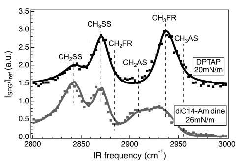 圖6。diC14 amdine在26 mN/m(灰色)下的SFG光譜(點(diǎn))和DPTAP(黑色)在20 mN/m下的SFG光譜(點(diǎn))。垂直線表示亞甲基對(duì)稱拉伸(CH2SS)、甲基對(duì)稱拉伸(CH3SS)、亞甲基非對(duì)稱拉伸費(fèi)米共振(CH2FR)、亞甲基非對(duì)稱拉伸(CH2AS)的位置,甲基對(duì)稱拉伸費(fèi)米共振(CH3FR)和甲基不對(duì)稱拉伸(CH3AS)。為清晰起見,DPTAP頻譜偏移。實(shí)體曲線使用洛倫茲模型擬合數(shù)據(jù)。