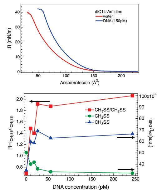 圖7。(上圖)在不存在(紅線)和存在(藍(lán)線,150μm)DNA的情況下,磷酸緩沖亞相上方的diC14氨基單層的π-面積等溫線。對(duì)于給定的脂質(zhì)密度,將DNA添加到亞相會(huì)導(dǎo)致表面壓力增加,或者相當(dāng)于脂質(zhì)分子的凝聚。(下圖)不同濃度的DNA溶液上的CH2SS和CH3SS共振(三角形和圓形,右軸)的VSF強(qiáng)度及其比率R(正方形,左軸)。實(shí)線是眼睛的向?qū)А?
