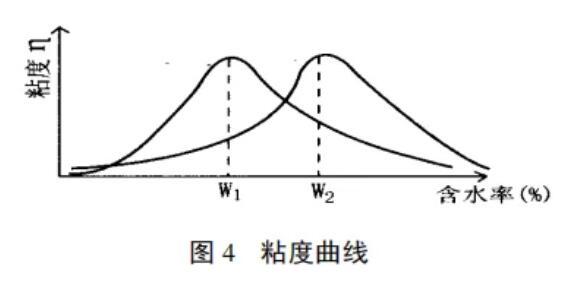 含水量高則流動(dòng)性好(即每個(gè)顆粒表層水膜厚),但凝聚性差,坯體易變形。因此,對每一企業(yè)來講,在原料處理、擠泥機(jī)等條件固定的前提下,摸索一個(gè)合適的成型含水率,既利于擠泥機(jī)成型,又利于磚坯強(qiáng)度。根據(jù)我們對幾十種黏土的試驗(yàn)數(shù)據(jù),每種黏土都有一個(gè)最佳含水率,在這種含水率的情況下,黏土的粘性(稠度)最好。典型的粘度曲線(見圖4):