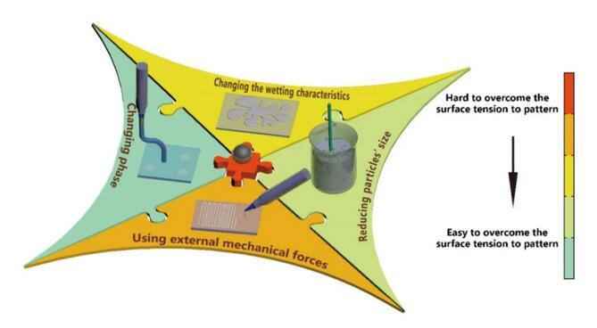 圖1克服液態(tài)金屬表面張力的四種策略及其成型的難易程度