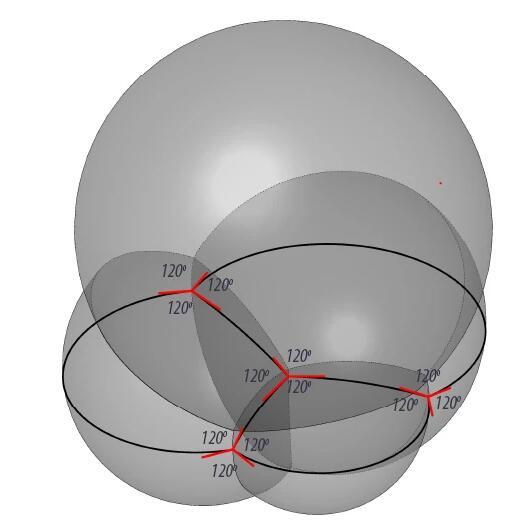 現(xiàn)在我們知道了表面張力決定泡泡的連接方式,泡沫總會找到一種具有最小表面張力的結(jié)構(gòu),也就是使總表面積最小的結(jié)構(gòu)。但是,關(guān)于泡沫的結(jié)構(gòu)還需要考慮另一個問題,即力學(xué)上的穩(wěn)定。在連接點(diǎn)處,沿著不同方向的作用力必須達(dá)到平衡。無論是泡泡筏的平鋪還是泡泡堆的四面相連,都是能滿足這一要求的連接方式。