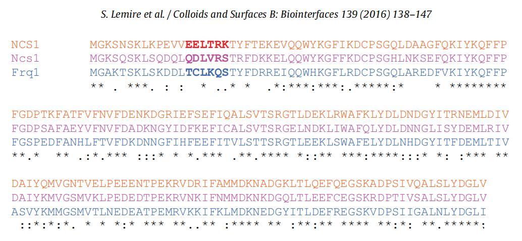 圖1.人類NCS1(橙色)、裂變酵母NCS1(粉紅色)和芽殖酵母Frq1(藍(lán)色)的序列比對。在鈣存在和不存在的情況下,負(fù)責(zé)肉豆蔻基擠出的基序用紅色表示[29](為了解釋本圖例中對顏色的引用,讀者請參閱本文的網(wǎng)絡(luò)版本)。