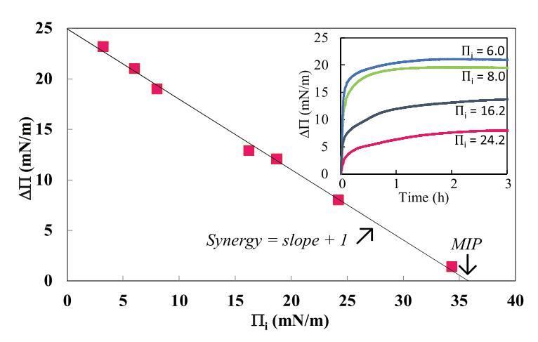 確定綁定參數(shù)的典型示例如圖2所示。實(shí)際上,對于6.0、8.0、16.2和24.2 mN/m的i,分別獲得了21.0、19.0、12.9和8.0 mN/m的(圖2插圖)。被繪制為i的函數(shù),導(dǎo)致負(fù)斜率。因此,在DPPE存在的情況下,mNCS1的MIP值為35.8±1.1 mN/m,協(xié)同值為0.30±0.02。這種積極的協(xié)同作用表明mNCS1和這種脂質(zhì)單層之間發(fā)生了積極的相互作用。然后,以不同的i注射每種脂質(zhì)和MIP,并根據(jù)表面壓力動力學(xué)計(jì)算協(xié)同值。