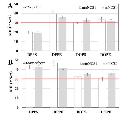 圖7比較了有無鈣時mNCS1和nmNCS1的MIP值(數(shù)值見表S6)。在PC或PE脂質(zhì)單分子膜存在下觀察到的所有MIP值均高于30 mN/m,表明肽可以優(yōu)先結(jié)合由兩性極性頭基組成的磷脂。所有這些MIP值相似(31.6和37.7 mN/m之間,DOPE除外),并且沒有顯示出對特定脂肪?;湹拿鞔_偏好。在PS脂質(zhì)單分子膜存在下觀察到的MIP值低于30 mN/m,但DOP除外,這可以由DO脂肪?;湹莫毺貥?gòu)象來解釋。此外,在存在DP、DS和DD脂肪酰基鏈的情況下,PE脂質(zhì)單分子膜的協(xié)同值高于PC和PS脂質(zhì)單分子膜的協(xié)同值。在DS脂肪?;湹那闆r下,用PE脂質(zhì)單層觀察到的協(xié)同值低于用PC觀察到的協(xié)同值,但優(yōu)于用PS觀察到的協(xié)同值。這些趨勢表明,N端肽參與了整個蛋白質(zhì)與由PE脂質(zhì)單層組成的磷脂的優(yōu)先結(jié)合。此外,關(guān)于脂肪?;?,沒有明顯的趨勢。事實上,在不飽和磷脂與聚苯乙烯的存在下觀察到更高的協(xié)同值,而在聚碳酸酯中觀察到相反的趨勢。除DOPE外,在PE中觀察到的所有協(xié)同值都很高。因此,這些數(shù)據(jù)表明,除了其N末端片段外,蛋白質(zhì)的其他結(jié)構(gòu)域也參與了膜結(jié)合。此外,在DOPE、DOPS和DPPE存在的情況下,計算了N端肽的速率系數(shù)(表S3)。速率系數(shù)比完整蛋白質(zhì)慢并且相對恒定(0.001 s?1,0.002秒?1和0.003秒?1分別為DOPE、DOPS和DPPE單層)。這一結(jié)果表明,NCS1的其他結(jié)構(gòu)域參與了蛋白質(zhì)與脂質(zhì)單層的相互作用速度。