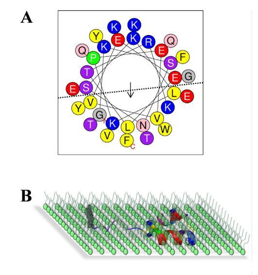 圖8.(A)使用在線工具Heliquest[78]建立的N-末端肽的螺旋輪表示法。顏色代碼如下:疏水殘基為黃色,絲氨酸和蘇氨酸為紫色,堿性殘基為藍色,酸性殘基為紅色,天冬酰胺和谷氨酰胺為粉紅色,脯氨酸為綠色,其他殘基為灰色。(B)在存在脂質(zhì)單層的情況下N-末端肽的方向的圖示。使用與(A)相同的顏色代碼(為了解釋本圖例中對顏色的引用,讀者請參閱本文的web版本)。