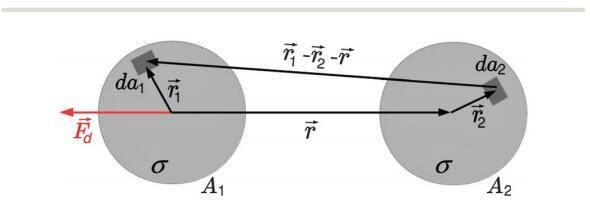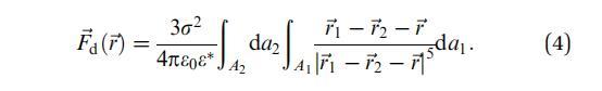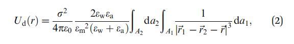 其中Ai表示域i的面積,dai表示其面積元素,-ri表示其相對(duì)于域中心的位置向量,i=1,2-r是從域1中心到域2中心的向量,如圖1所示。e0是真空介電常數(shù),ew和ea分別是水和空氣的相對(duì)介電常數(shù)。在這里,我們使用了Urbakh等人21的研究結(jié)果,該研究描述了由兩個(gè)半無(wú)限介質(zhì)包圍的薄電介質(zhì)層中偶極子之間的相互作用。