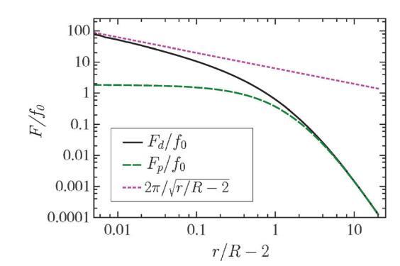 圖2顯示了兩個(gè)半徑相等的圓形區(qū)域的Fd(r)(實(shí)線)和Fp(r)(虛線)。疊加在等式(4)的數(shù)值解上,我們添加了等式(5)(虛線)的短距離的漸近表達(dá)式。注意,當(dāng)兩個(gè)域接近接觸(r=2R)時(shí),F(xiàn)d發(fā)散,而Fp保持有限。此外,對(duì)于實(shí)驗(yàn)感興趣的范圍2R o r o 10R,兩個(gè)力之間的差異是可觀的。特別是,即使r=5R,差值也在15%左右。