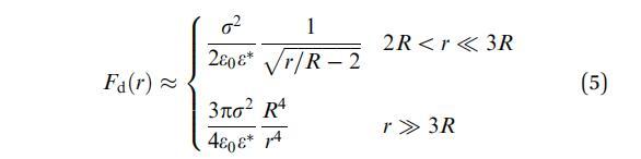 該力沿中心線分布,其大小僅取決于域之間的距離r。Fd(r)沒(méi)有解析表達(dá)式,因此必須進(jìn)行數(shù)值計(jì)算。然而,對(duì)于單分散系統(tǒng)的特殊情況(所有域半徑等于R),Wurlitzer等人22發(fā)現(xiàn)該力的漸近行為為: