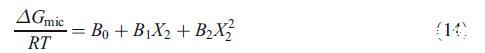為了補(bǔ)充混合膠束分析的穩(wěn)定性,我們還使用了Maeda的方法,該方法還考慮了混合膠束中的疏水鏈-鏈相互作用,特別是當(dāng)鏈長度不同時[21]。簡言之,根據(jù)Maeda的模型,離子物種向非離子膠束的轉(zhuǎn)移包括兩種不同的貢獻(xiàn):極性頭部基團(tuán)之間的相互作用和疏水鏈之間的相互影響。當(dāng)疏水鏈相似時,第一貢獻(xiàn)占主導(dǎo)地位,然而,當(dāng)疏水鏈長度不同時,這些鏈之間的相互作用變得更為主導(dǎo)。Maeda的方法強(qiáng)調(diào),除了從規(guī)則溶液理論獲得的相互作用參數(shù)之外,還有另一個參數(shù)(B1),該參數(shù)有助于在用離子單體替換非離子純膠束中的非離子表面活性劑單體時混合膠束的穩(wěn)定性。這一過程是由于組件之間的短程相互作用而產(chǎn)生的。在該模型中,膠束化自由能(ΔGmic)作為混合膠束中離子物種摩爾分?jǐn)?shù)的函數(shù)給出如下[21,24]: