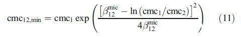 另一方面,在混合膠束形成過程中,含有兩種表面活性劑的混合物中協(xié)同作用的存在不僅取決于它們之間相互作用的強(qiáng)度,還取決于二元兩親混合物中單個表面活性劑組分的相關(guān)性質(zhì)[23]。因此,混合膠束形成中協(xié)同作用所需的條件是bmic 12必須為負(fù)(見上節(jié)),且βmic 12>jlnecmc1=cmc2Tj(表2)。對于本二元混合物,這兩個條件都滿足?;旌夏z束形成中可能的協(xié)同程度通過混合表面活性劑的摩爾濃度與單個組分的摩爾濃度相比的最大降低來測量,即(cmc1)?cmc12,min)/(cmc1),其中cmc12,min是混合表面活性劑的最小cmc,由下式給出: