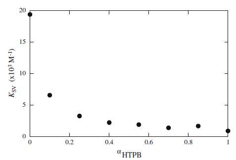 KSV值根據(jù)公式20(數(shù)據(jù)未顯示)的斜率進(jìn)行評估,如圖6所示。圖6顯示KSV的值隨著HTPB成分含量的增加而降低,反映出熒光團(tuán)變得更難接近猝滅劑。據(jù)報道,隨著陽離子gemini表面活性劑摩爾組成的增加,KSV降低[24]。