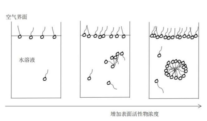 我們?cè)谖恼麻_頭介紹過(guò),表面活性劑是一種兩親的分子,一頭親水一頭親油。因此,低濃度時(shí)表面活性劑傾向于留在水的表面,親油(厭水)的一頭朝外,首先布滿水面,也就是水-空氣界面,所以會(huì)降低這個(gè)界面的張力。