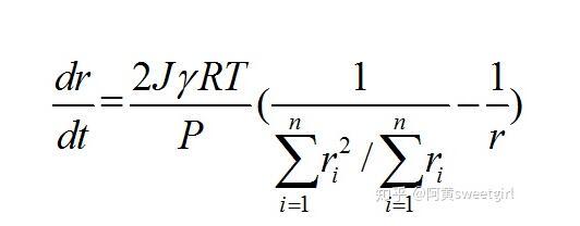 假設(shè)氣體符合氣體理想氣體方程,即PV=nRT,對(duì)于球形氣泡,體積V=4πr^3/3,從而可把摩爾速率轉(zhuǎn)化為氣泡半徑變化的速率。通過(guò)以上各式,可得