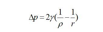 從定性的角度來(lái)看,氣泡的Ostwald熟化的過(guò)程是大氣泡吸收小氣泡的過(guò)程。但從定量上的角度來(lái)說(shuō),在氣泡演變的任一時(shí)刻,到底尺寸為多少的氣泡傾向?yàn)殚L(zhǎng)大,而尺寸為多少的氣泡減小而傾向于消失呢?1978年,美國(guó)辛那提大學(xué)的Robert Lemlich建立模型解決了這個(gè)問(wèn)題(Ref 3)。Lemlich的理論核心和依據(jù)是:1)假設(shè)所有的氣泡內(nèi)的液體相互擴(kuò)散時(shí),都是先把氣體擴(kuò)散到液體中,再通過(guò)液體擴(kuò)散到其他氣泡中實(shí)現(xiàn)Ostwald熟化過(guò)程(圖1a),這個(gè)假設(shè)在氣泡含量不高,不是相互接觸的情形下是合理的。2)在氣泡演化的任何一個(gè)時(shí)刻,液體中氣體的濃度是均勻一致的,這個(gè)假設(shè)在研究所有氣泡的演化整體行為上是可行的。3)依據(jù)亨利定律,這個(gè)液體中氣體的濃度可以等價(jià)為液體內(nèi)部有一個(gè)氣體壓強(qiáng),而這個(gè)壓強(qiáng)可以看成是一個(gè)假想的氣泡內(nèi)部的壓強(qiáng)(圖1b),其半徑ρ可以依據(jù)Laplace方程計(jì)算出來(lái)。所以,所謂氣泡演化就是所有氣泡跟這個(gè)假想的氣泡進(jìn)行氣體交流。這樣就把體系中氣泡演變多對(duì)多擴(kuò)散的復(fù)雜情形簡(jiǎn)化為了多對(duì)一的演變過(guò)程。由此,體系中任意一個(gè)半徑為r氣泡與這個(gè)液體的中假想的氣泡的壓強(qiáng)差△P為