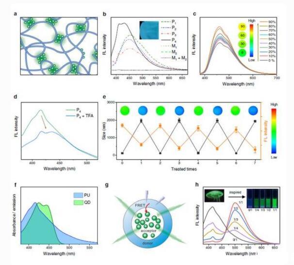 而當(dāng)去除三氟乙酸后,熒光和粒徑又會(huì)恢復(fù),并能進(jìn)行多次循環(huán)。這種構(gòu)象介導(dǎo)的變形現(xiàn)象和變色現(xiàn)象,與水母在呼吸時(shí)隨著膨脹和收縮,所表現(xiàn)出的熒光轉(zhuǎn)變行為十分相似。