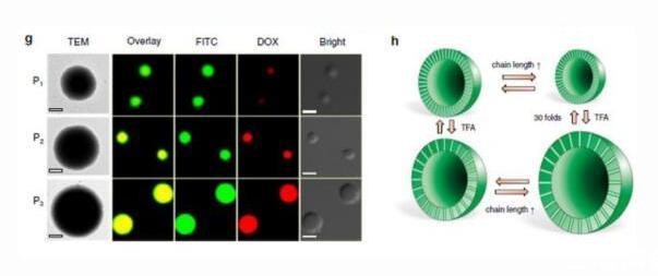當(dāng)加入三氟乙酸試劑之后,即可調(diào)控氫鍵的相互作用,實(shí)現(xiàn)囊泡的可逆"呼吸"。同時(shí),囊泡的尺寸也能在5-30倍的范圍內(nèi)實(shí)現(xiàn)可逆變化。