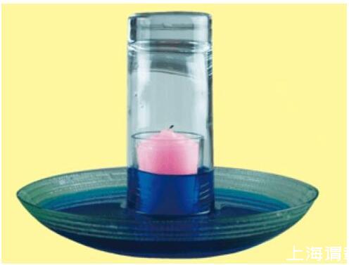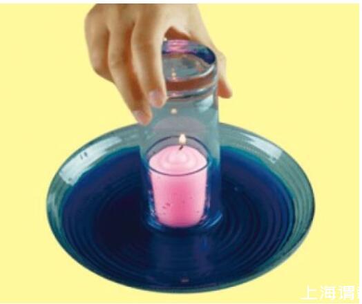 解密時(shí)刻:當(dāng)蠟燭熄滅時(shí),玻璃杯中的水會(huì)逐漸上升,上升到一定程度后,停止。因?yàn)橄灎T燃燒,消耗了玻璃杯中的氧氣,減少的這部分氧氣被水填充。
