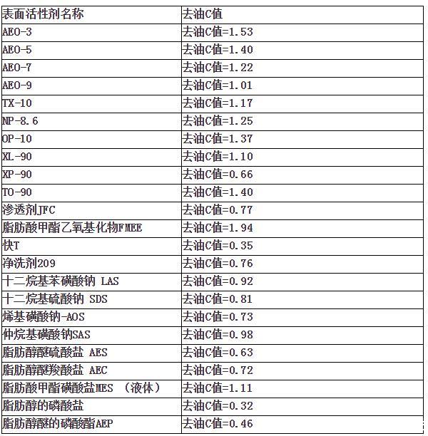 C=試樣去油質(zhì)量/標(biāo)準(zhǔn)配方去油質(zhì)量,C值越大,表明表面活性劑的去油能力越強