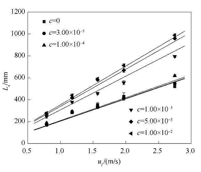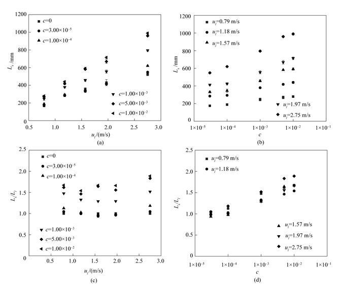為了定量表征表面張力變化對射流破裂過程的影響,實(shí)驗(yàn)測量了含表面活性劑射流的射流破裂長度。射流破裂長度定義為噴嘴出口至射流首次發(fā)生破裂處的距離。圖6是含表面活性劑射流破裂長度隨射流速度u l的變化趨勢,其中L s(mm)表示含表面活性劑射流的射流破裂長度,L l(mm)為水的射流破裂長度。從圖6(a)中可以看出,當(dāng)表面活性劑濃度保持不變時(shí),提高液體射流速度會增大射流破裂長度。從圖6(b)中可以看出,當(dāng)液體射流速度保持不變時(shí),隨著表面活性劑濃度的增大,射流破裂長度總體上呈現(xiàn)逐漸增大的趨勢;射流速度越大,射流破裂長度增大的趨勢就越明顯。使用相同工況下水的射流破裂長度無量綱化含表面活性劑射流的破裂長度后,可以得到射流破裂長度比隨射流速度以及表面活性劑濃度的變化趨勢,如圖6(c)、(d)所示。從圖中可以看出,表面活性劑的加入顯著增大了射流破裂長度比。在表面活性劑濃度不變時(shí),提高液體射流速度對射流破裂長度比的影響并不顯著。在射流速度保持不變時(shí),提高表面活性劑濃度會導(dǎo)致射流破裂長度比的增大。