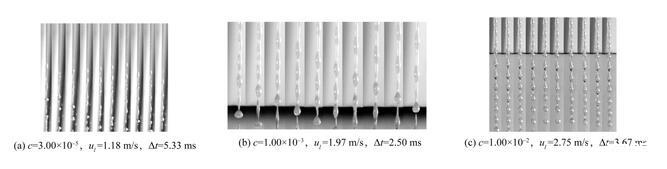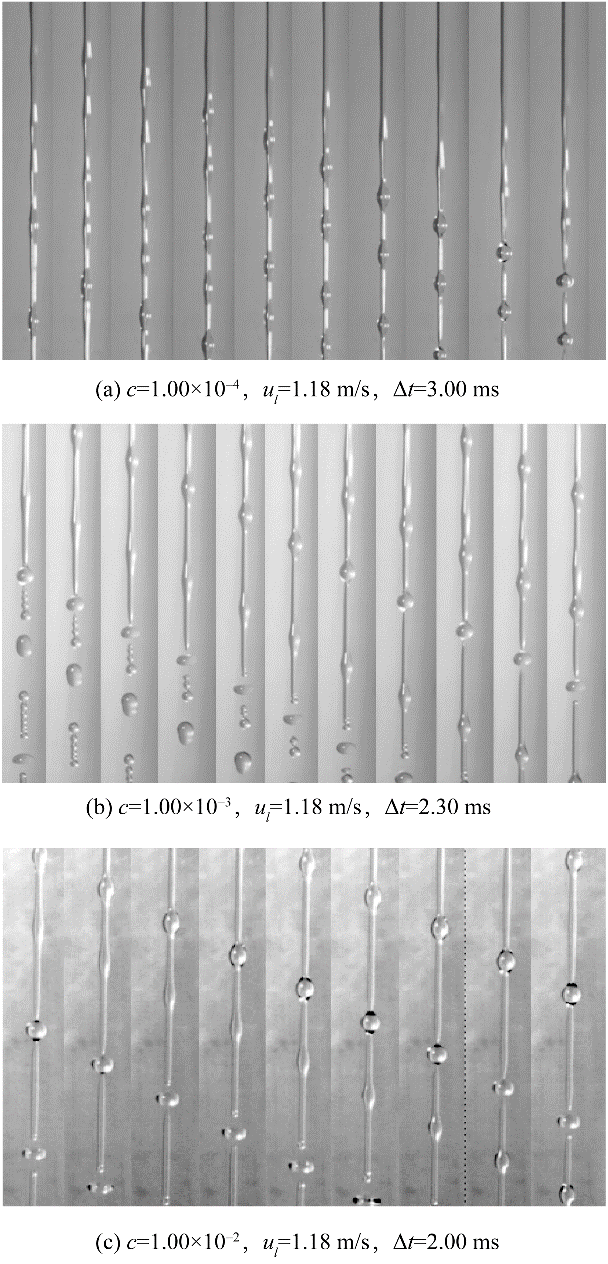 本文首先研究了不含氣泡的表面活性劑射流破裂過程以探究表面張力變化對射流破裂特征的影響。實(shí)驗(yàn)使用高速相機(jī)記錄了六種不同濃度表面活性劑溶液的射流破裂過程。實(shí)驗(yàn)獲得的射流破裂過程如圖5所示,其中Δt是相鄰兩張圖片間的時(shí)間間隔。從圖5中可以看出,雖然表面活性劑濃度并不相同,但射流的破裂過程在形態(tài)上是相似的。當(dāng)液體射流離開噴嘴后,射流表面擾動迅速增長,表面波動在射流表面呈對稱分布,這是射流破裂Rayleigh區(qū)的典型特征。隨著表面波動的進(jìn)一步發(fā)展,在射流方向上,射流表面形成瘤狀結(jié)構(gòu),射流破裂發(fā)生在兩個(gè)瘤狀結(jié)構(gòu)之間。