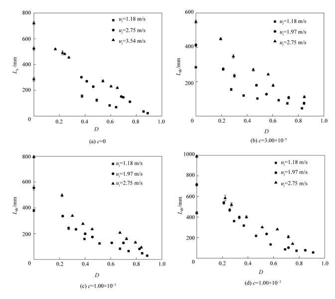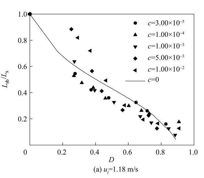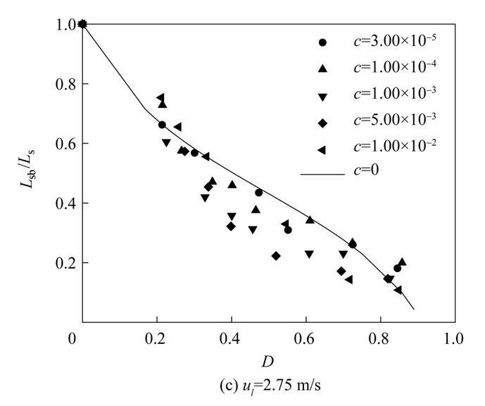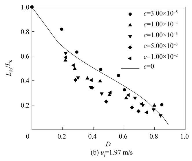 圖11是不同濃度表面活性劑射流破裂長度L sb隨氣泡無量綱直徑D=d b/d 0(d b為氣泡直徑)的變化。從圖中可以看出,不同表面活性劑濃度下,射流破裂長度隨氣泡無量綱直徑D的變化趨勢是相似的。射流破裂長度隨著氣泡直徑的增大逐漸減??;當(dāng)氣泡直徑相同時(shí),提高液體射流速度會導(dǎo)致更大的射流破裂長度。