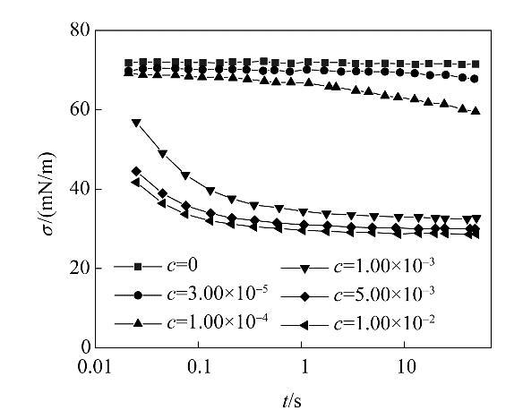 圖3不同濃度表面活性劑溶液的動態(tài)表面張力Fig.3Dynamic surface tension at various surfactant concentrations