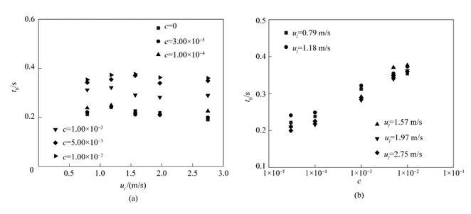 從圖7(a)中可以看出,當(dāng)表面活性劑濃度保持不變時(shí),射流破裂時(shí)間幾乎不隨射流速度的改變而改變。在射流速度保持不變時(shí),隨著表面活性劑濃度的增大,射流破裂時(shí)間呈現(xiàn)逐漸增長的趨勢。在實(shí)驗(yàn)參數(shù)范圍內(nèi),射流破裂時(shí)間均小于0.4 s??紤]重力對液體射流的加速作用,液體射流實(shí)際破裂時(shí)間要小于0.4 s。