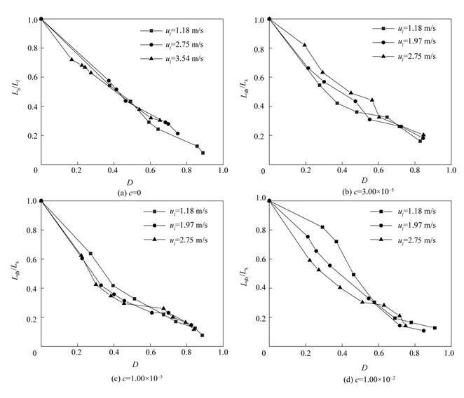 如圖12所示,當(dāng)氣泡直徑較大時(shí),破裂長度比基本不隨射流速度的改變而改變。這是由于此時(shí)氣泡引起的射流速度擾動對射流破裂的影響占主導(dǎo)地位。在氣泡直徑較小時(shí),當(dāng)表面活性劑濃度c<1.00×10-2,不同射流速度下射流破裂長度比基本相同。當(dāng)表面活性劑濃度c=1.00×10-2,破裂長度比隨著射流速度的增大而逐漸減小。這可能與被削弱的Marangoni效應(yīng)有關(guān)。由式(10)可知,液體射流速度越大,液體對流造成的表面活性劑表面吸附量減少的趨勢越強(qiáng),波峰波谷間的表面張力差值越小,Marangoni效應(yīng)越弱,射流破裂長度增加的趨勢越弱。因此,在氣泡較小時(shí),隨著射流速度的增大,含氣泡射流的破裂長度比逐漸減小。在表面活性劑濃度較小時(shí),氣泡的存在進(jìn)一步減小了射流內(nèi)部表面活性劑的濃度,從而使得不同射流速度下Marangoni效應(yīng)的差別不明顯,不同射流速度下射流破裂長度比基本相同。