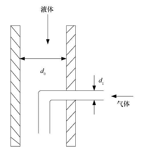 實(shí)驗(yàn)流程如圖1所示。來自注射泵的氣體通過充氣通道進(jìn)入噴嘴并在噴嘴內(nèi)形成氣泡,并與來自液體流量計(jì)的液體相混合形成氣液混合物。該氣液混合物離開噴嘴后,在不穩(wěn)定波的作用下發(fā)生破裂,使用高速相機(jī)記錄這一過程,并使用開源軟件ImageJ分析處理得到的圖片。實(shí)驗(yàn)通過控制注入噴嘴的氣體流量從而得到不同液體射流速度下直徑近似相等的氣泡。實(shí)驗(yàn)使用的噴嘴如圖2所示。其中,噴嘴內(nèi)徑d 0=2.96 mm,充氣通道外徑d 1=0.50 mm。