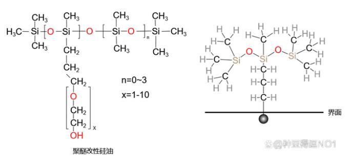 水性體系使用較多的有機硅潤濕劑一般為聚醚改性硅油,相對分子質(zhì)量較小,n=0~3,x=1~10。同時大量的CH3鏈對外伸展,極大的降低表面張力,研究表明當(dāng)親水基在鏈段中部位置時,效果最好。聚醚改性有機硅的分子結(jié)構(gòu)式和機理如上圖所示。