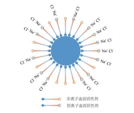 抑塵劑主要由陰離子表面活性劑、非離子表面活性劑以及其他助劑組成。其中,表面活性劑是一種具有兩親性的物質(zhì),加入少量能使其溶液體系的界面狀態(tài)發(fā)生明顯變化,是抑塵劑的重要組成部分。如圖4所示,煤塵表面暴露著大量的極性有機基團,水在煤塵表面很難發(fā)生潤濕行為;抑塵劑中的表面活性劑親油端與煤塵表面的有機基團具有較好的相容性,能夠在煤塵表面定向排列并且將親水基團引入煤塵表面,增加了水與煤塵之間的潤濕能力。無機鹽的引入對于陰離子表面活性劑具有增效作用。根據(jù)雙電層理論,雙電層可以分為緊密層和擴散層,當溶液中加入無機鹽后,無機鹽中的離子會壓縮擴散層,使得擴散層厚度減小,從而降低了界面能;同時其無機鹽離子還能減小雙電層中的靜電力作用,促進了抑塵劑在煤塵表面的吸附,提高了潤濕性能。